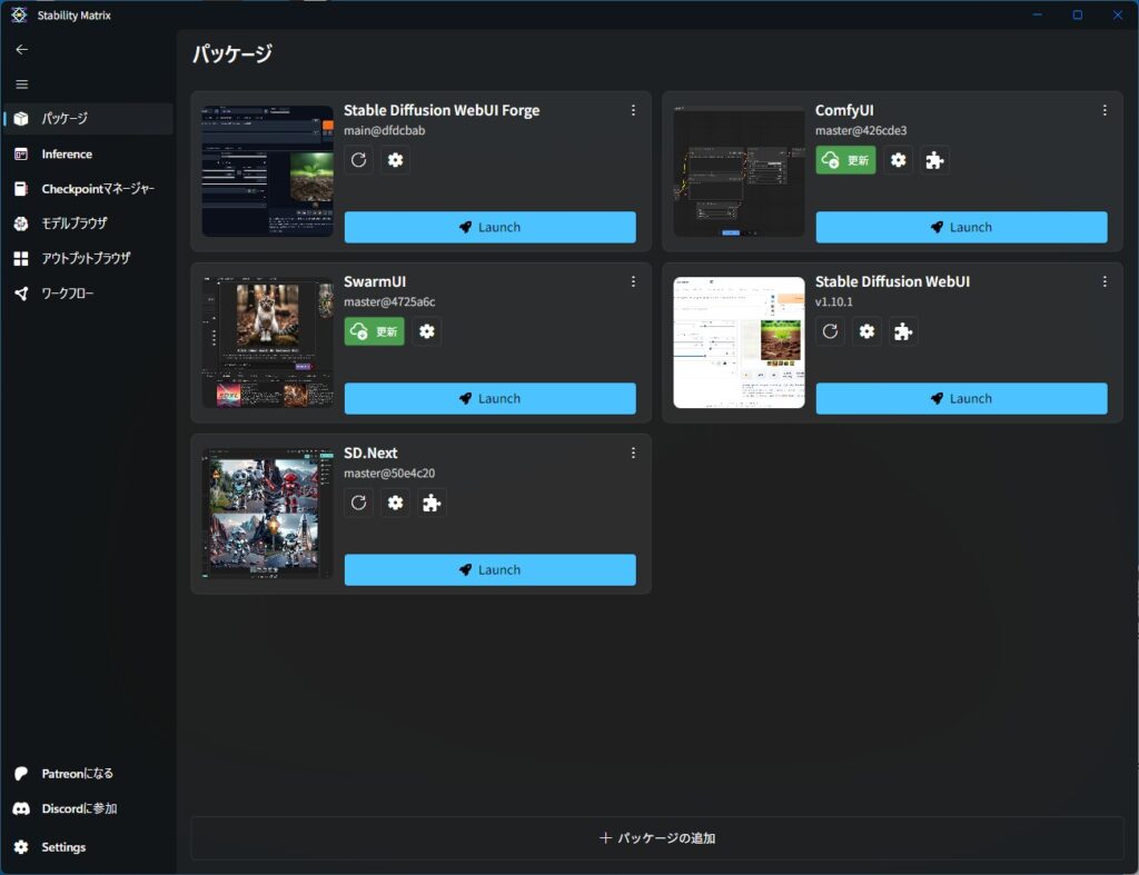次に、ソケットエラーが出ている。これはWebブラウザーでUIを表示するのに起動のやり方が違うと出て、パッケージが起動しないのだ。これはまたOKなパッケージがないかと探してみた。すると「SD.next」というパッケージならOKなようだった。